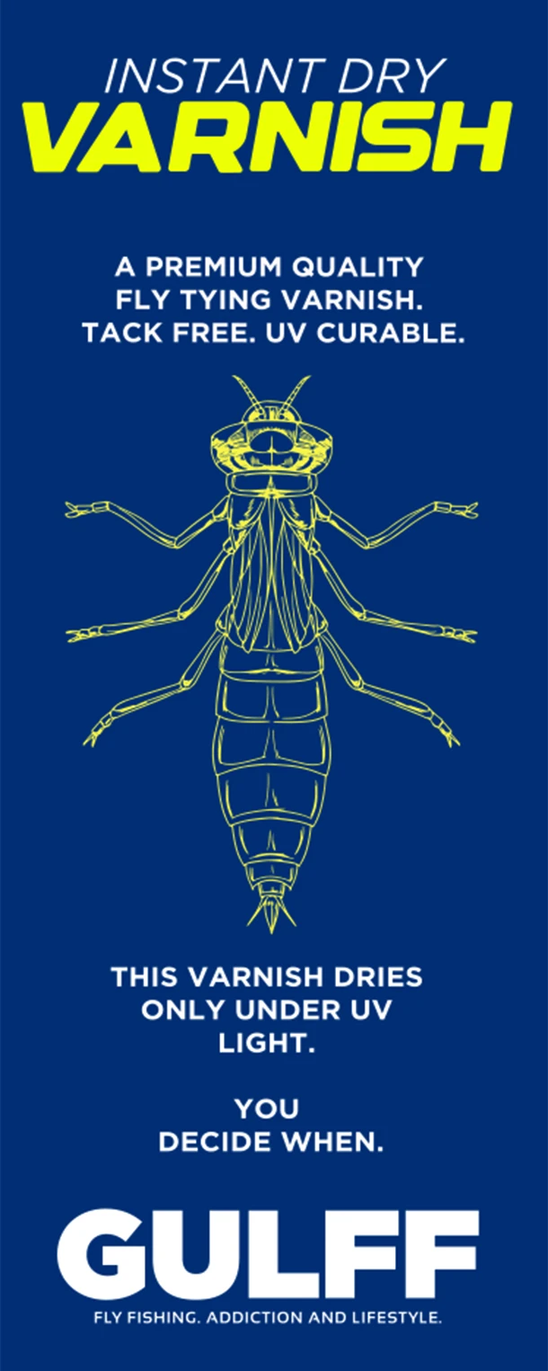 This hot new varnish dries only under UV light and sunlight. Curing time is only a few seconds. Shape the fly as long as wanted, dry the fly when it is needed, you decide. The smell is very low. The finishing is crystal clear and tack free. Bottle includes a brush.