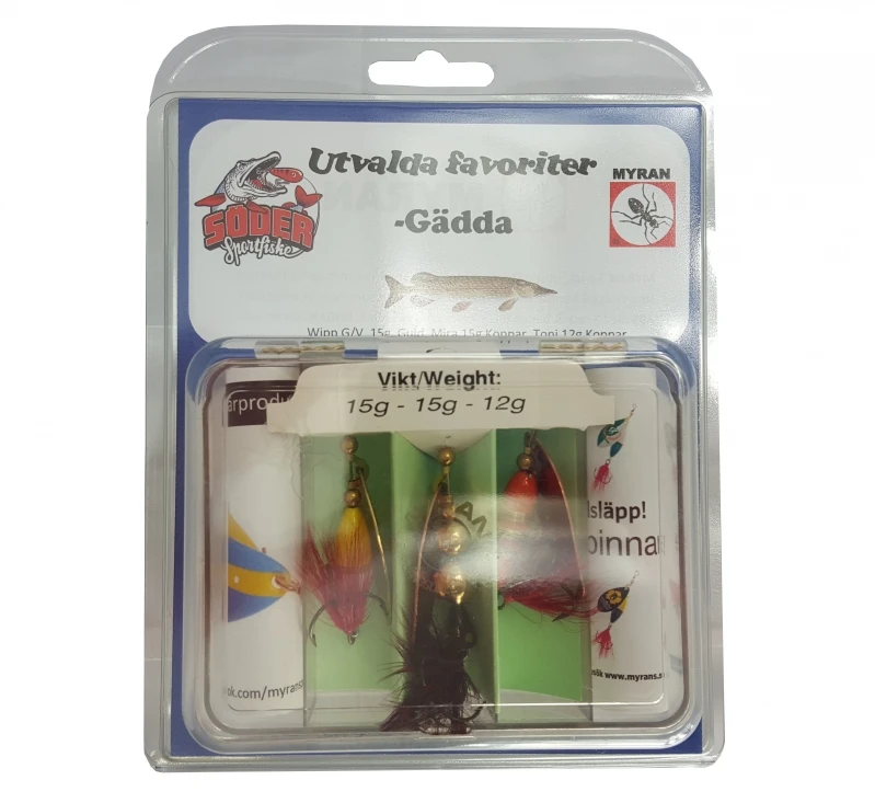 Comes in a two-part box made of durable ABS with 5 compartments and hinge in brass made to last long in both cold and heat. MYRAN spinners & boxes made in Sweden.Utvalda Favoriter (Selected favorites): Wipp HOT 10g Silver, Mira 10g Copper, Wipp G / V 10g Copper Sommarmix (Summermix): Wipp G / V 10g Gold, Wipp Sv / Or 10g Copper, Mira 7g CopperRegnbåge (Rainbow Trout): Mira 10g Zulo, Akka HOT 7g Silver, Wipp HOT 7g CopperHarr (Grayling): Panther 7g Black, Panther HOT R 10g Black, Panther 7g K / HÄdelfisk (Char, salmon, rainbow trout, grayling): Agat 10g Silver, Wipp 7g Zulo, Mira 10g CopperAbborre (Perch): Wipp G / V 10g Gold, Toni 7g Copper, Wipp Sv / Or 10g SilverGädda (Pike): Wipp G / V 15g Gold, Mira 15g Copper, Toni 12g Copper