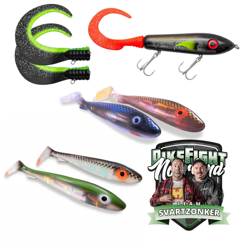 Kit with lures that Team SvartZonker used in the PikeFight 2020 competition!Svartzonker McRubber Jr 17cm Flash Series (2-pack)Don’t get fooled by the size. Even though McRubber Jr, with it’s 17cm looks quite small, the pikes can’t leave it alone. You can rig it with one or two hooks on the stinger, or a offset hook for narrow waters. It only weighs 45 grams, so you can easily fish it on lighter gear, but hold on tight, the big pikes won’t say no.McRubber Flash – a blend of the best from two worlds.The soft features that give the rubber lure its glorious movement have been combined with the unique “glittering” of a spoon, which encourages all predatory fish to instinctive and hard strikes!The embedded foil captures and reflects light, which can be a crucial factor if the fish is to bite or not.• Length: 17cm• Weight: 45g• 2pcsSvartZonker McRubber 21cm UV Series (2-pack)The McRubber can’t have a clean conscience. For years now, big pikes have been fooled, and they still are.With it’s 88 grams and 21 cm the McRubber has become a classic rubber bait that swings it paddle through the water with great self confidence. Pushes a lot of water and makes a lot of noise.Use screw in heads, shallow screws or screw in dots. We have all the accessories, your imagination is the only limit.The UV series is simply mcrubbers “extra everything”.Boosted with strong UV pigment that often is a game changer in your lure box.UV Suits best in clear water and sun, when the UV light is the strongest at dawn and dusk. They give off a strong bluish glow that our predators love.• Length: 21cm• Weight: 88gSvartZonker Big McRubber 25cm (2-pack)Big brother is a heavy weight champion in the McRubber family. A true giant that catches big fish all over the world. The paddle pushes loads of water as this big fellow makes way through the depths.Let it hang in the water every once in a while to give the fish that extra second to bite. Tackle it up with a big double stinger for best hook set.• Length: 25cm• Weight: 116gSvartZonker Mctail V1The Mighty McTail Original has secured victory in many pike tournaments and caught many trophy pikes and muskys. It’s easy to fish and with it’s uniqe darting, eratic, gliding, belly rolling, tail rippeling side to side action. It will get any predatory fish attention. The McTail is a lure that can be tweked in many different way’s to suit your own personal fishing style.It’s a great hybrid lure that’s very simple to modify, rig it with a Svartzonker BigTail and it becomes a juicy whopper for any big fish. You can also mount it with the Svartzonker Paddle and transform it to an eye-catching, rolling swimbait.• Body 13,5 cm / 5.3 inches • Body with tail 26 cm / 10.2 inches • Weight: 94g• Wide profile that moves a lot of water• Stainles steel wire throuh the bait • Hand painted in super slick and uniqe color patterns• Stainlees steel tail screw for easy tail mounting• Heavy duty stainless steel split rings • Armed with super sharp VMC original hooks SvartZonker Big Tail (2-pack)The BigTail is a perfect tail for all types of gilde, jerk and tail baits. The wider and thinner tail works in any kind of speed with a rippling swimming action.This will give the lure extra movment and attention. You can also mount it directly onto hybrid- and glide baits. Add a drop of super glue and adjust the body!Sold with the Svartzonker tail rig.• Length: 26cm• Weight: 29g• 2pcs