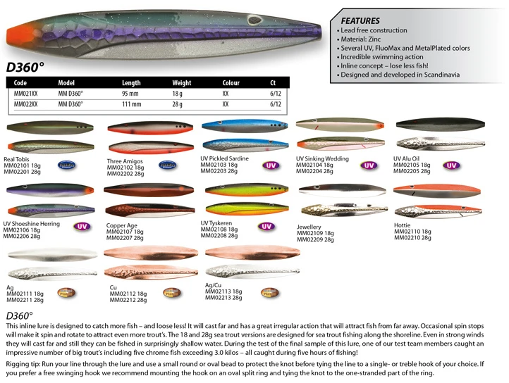 Narrower than the original D360° and with more weight in the tail, it allows you to cast to the horizon – even in a stiff wind – in search of the best fish. It rotates in the retrieve making the big seatrout go wild, and comes in a wide range of irresistible handpainted colours. Just cast it out and watch it go like a fish-seeking rocket!Lead FreeMaterial: ZincLong cast designDurable hand painted detailed colorsInline concept – lose less fish!Designed and developed in Scandinavia